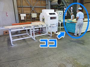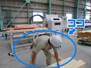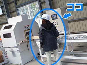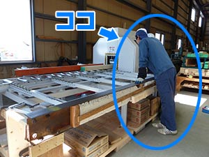 下の写真は合わせマグサ自動釘うち機で実際に柱製造を行っている作業者様の写真です。