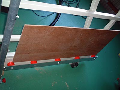 写真のように板材をのせ、カットを行います。