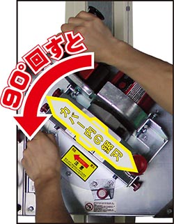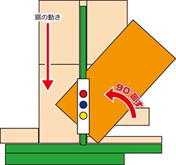 ターンテーブル上のロックピンを引き、鋸を90度回転させることにより、