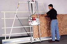 面材の仮留めを行った壁パネルの窓抜き加工から、